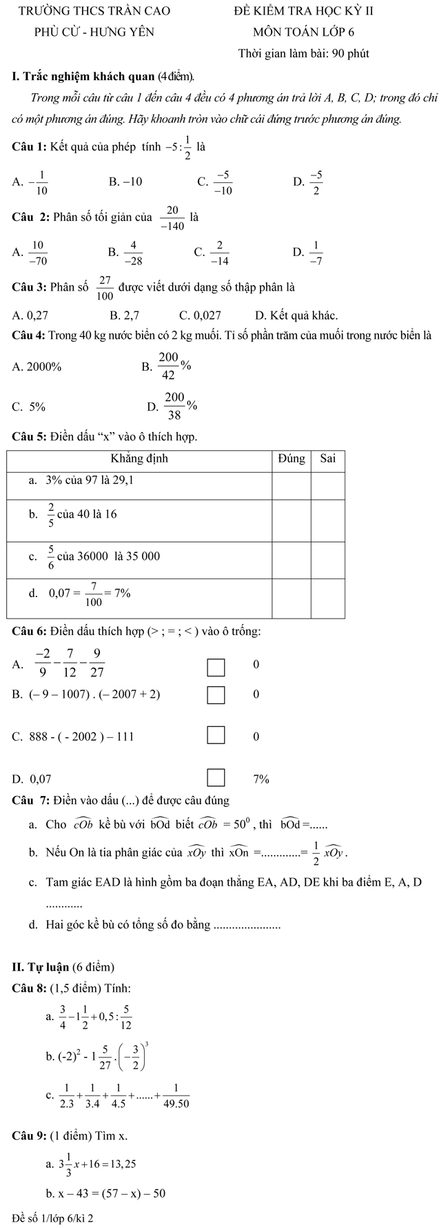 Tìm hiểu thêm »Đề kiểm tra học kì II môn Toán dành cho học sinh THCS lớp 6 (Đề 1) - Trường THCS Trần Cao, Phù Cừ, Hưng Yên