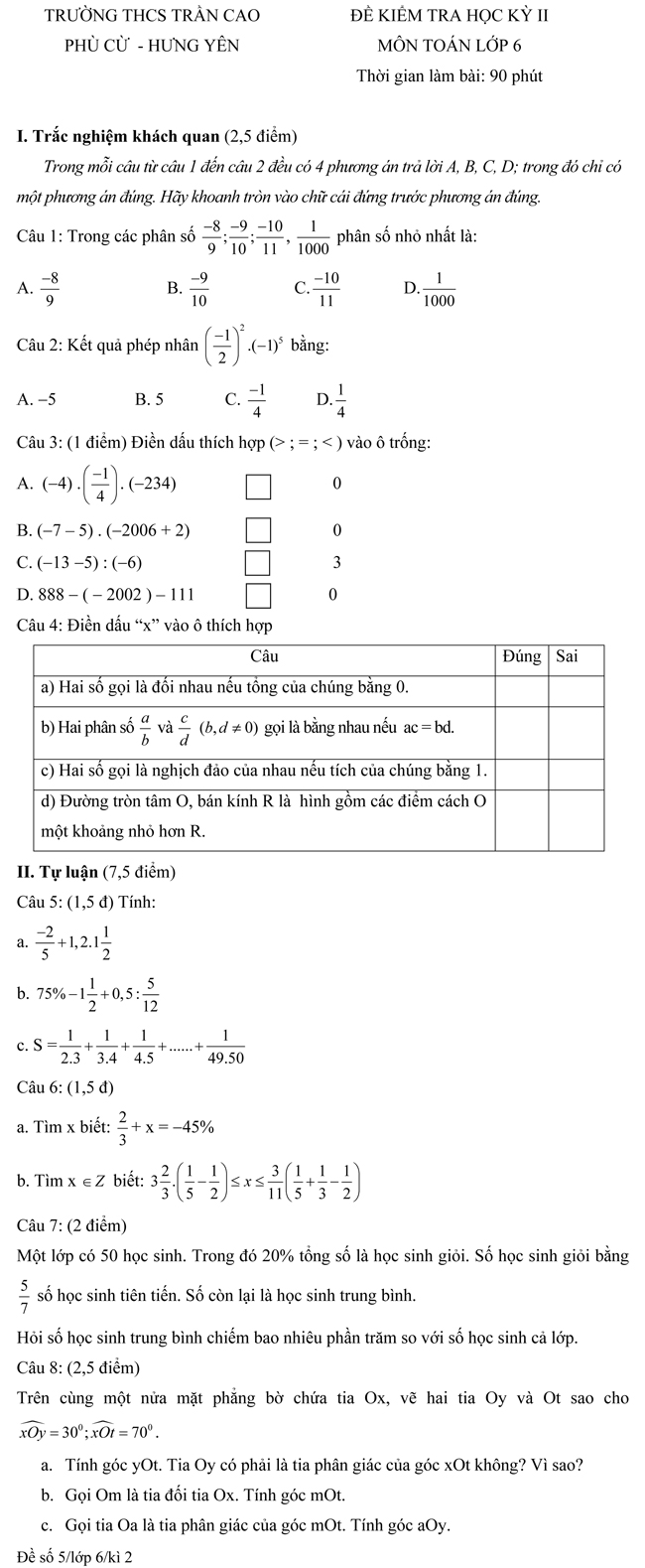 Tìm hiểu thêm »Đề kiểm tra học kì II môn Toán dành cho học sinh THCS lớp 6 (Đề 5) - Trường THCS Trần Cao, Phù Cừ, Hưng Yên