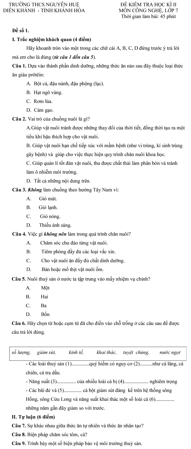 Đề kiểm tra học kì II lớp 7 môn Công nghệ - Trường THCS Nguyễn Huệ, Khánh Hòa (Đề 1) Đề kiểm tra môn Công nghệ