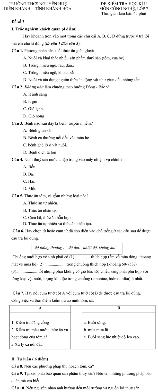 Tìm hiểu thêm »Đề kiểm tra môn Công nghệ học kì II dành cho học sinh THCS lớp 7 - Trường THCS Nguyễn Huệ, Diên Khánh, Khánh Hòa - Đề số 2
