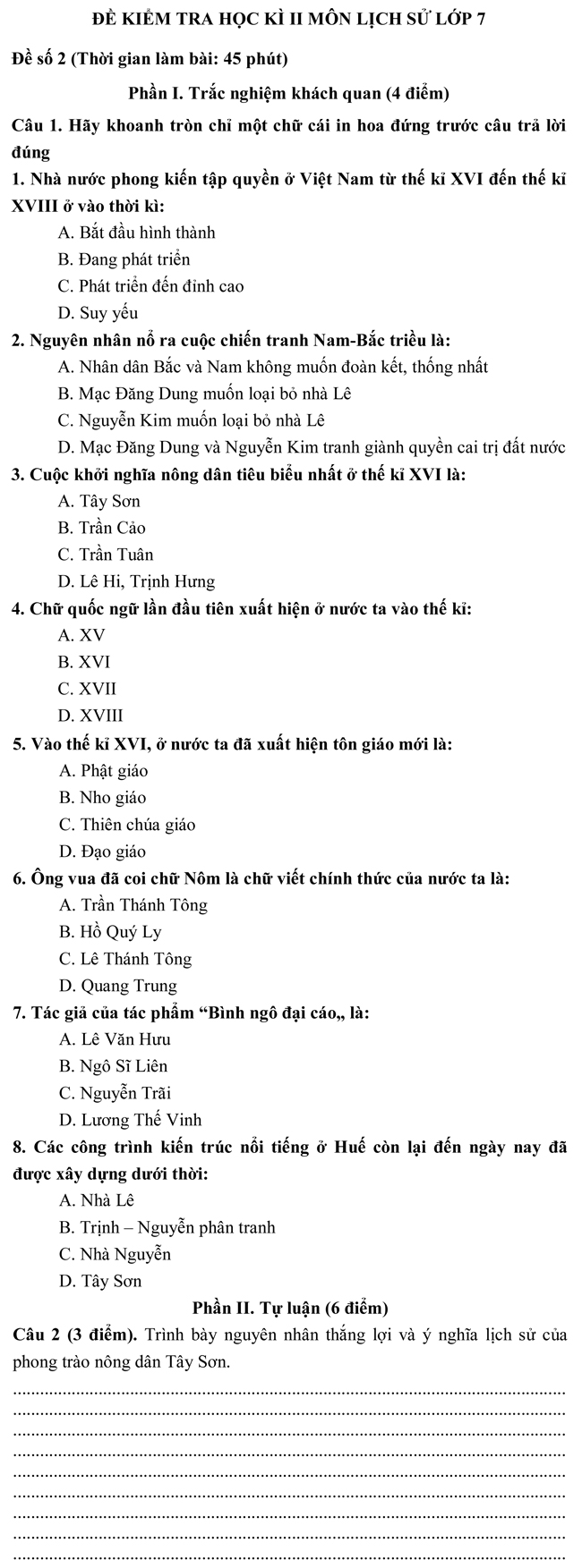 Tìm hiểu thêm »Đề kiểm tra học kì II môn Lịch sử dành cho học sinh THCS lớp 7 - Đề số 2