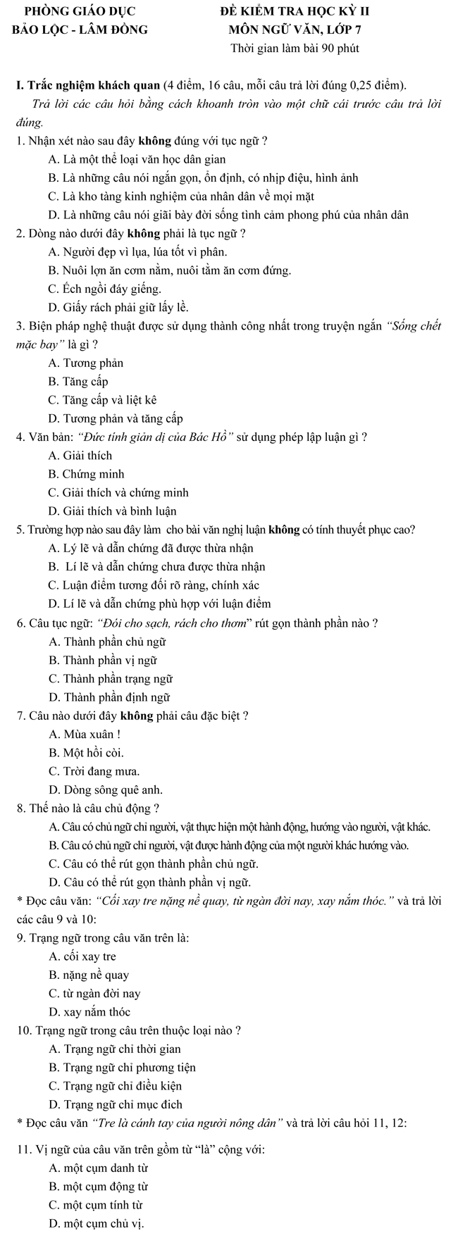 Tìm hiểu thêm »Đề kiểm tra học kì II môn Ngữ văn lớp 7 - Phòng Giáo dục Bảo Lộc, tỉnh Lâm Đồng