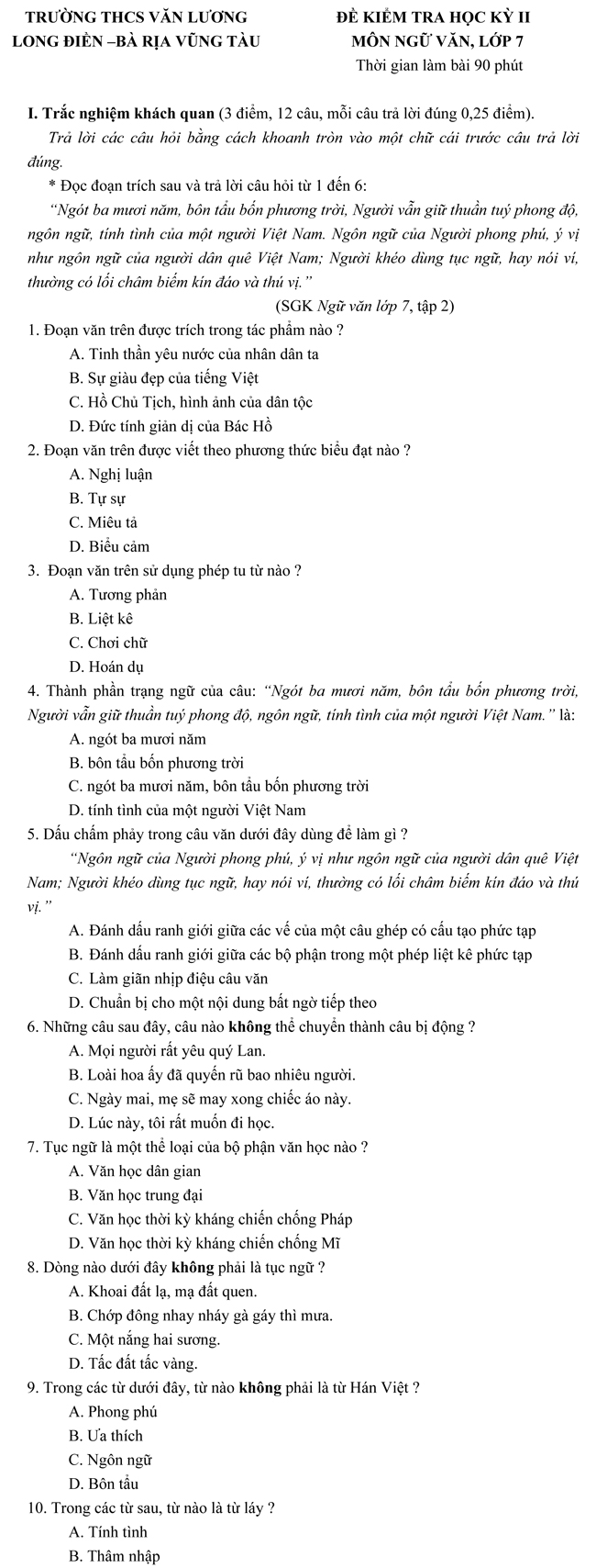 Tìm hiểu thêm »Đề kiểm tra học kì II môn Ngữ văn lớp 7 dành cho học sinh THCS Văn Lương, Long Điền - Bà Rịa Vũng Tàu