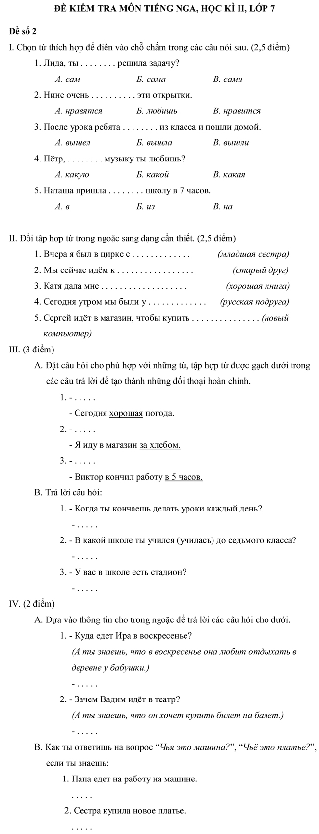 Tìm hiểu thêm »Đề kiểm tra học kì II môn tiếng Nga dành cho học sinh THCS lớp 7 - Đề số 2