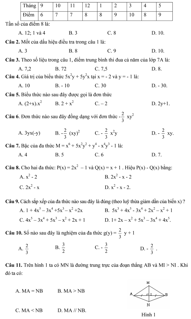 Câu 1. Điểm thi đua các tháng trong một năm học của lớp 7A được liệt kê trong bảng: