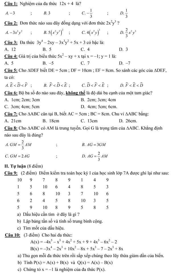 Đề kiểm tra học kì II lớp 7 môn Toán - Phòng GD Quận 3 TP Hồ Chí Minh Đề kiểm tra môn Toán