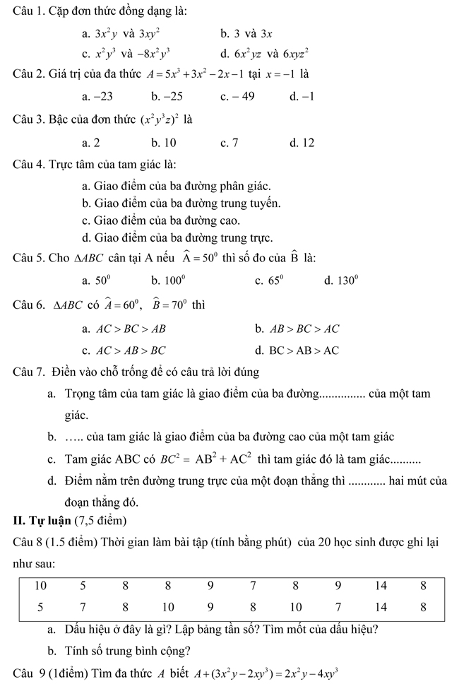 I. Trắc nghiệm khách quan (2,5 điểm).