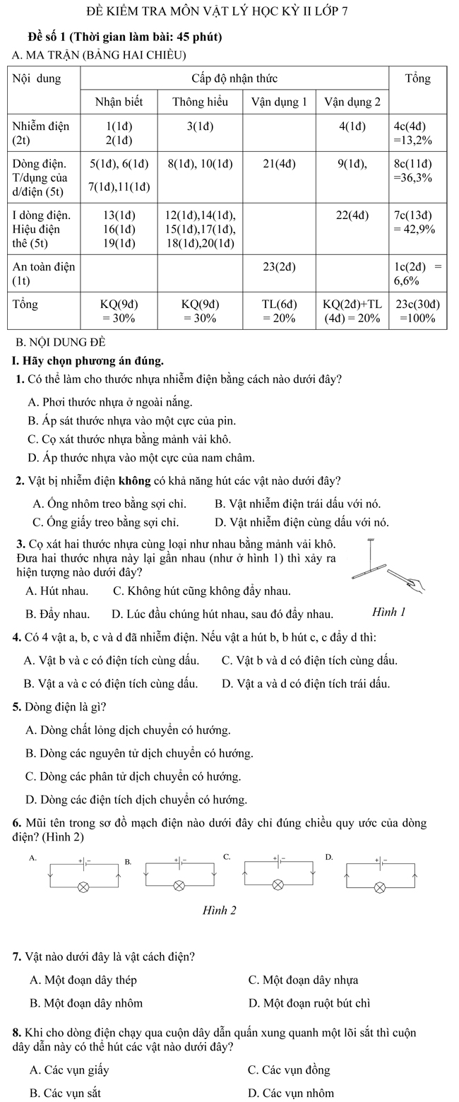 Đề kiểm tra học kì II lớp 7 môn Vật lý - Đề số 1 Đề kiểm tra Vật lý