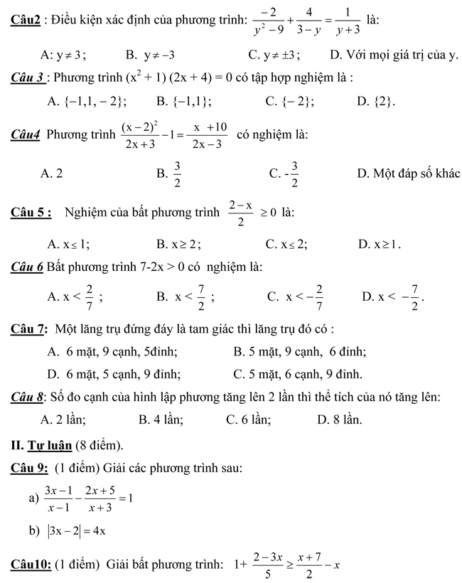 Câu 1: Trong các phương trình sau, phương trình nào là phương trình bậc nhất một ẩn