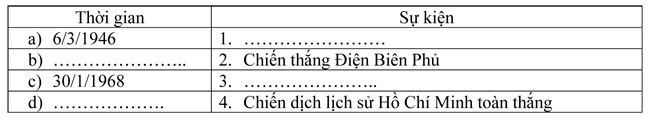 Câu 2: Điền tiếp thời gian hoặc sự kiện lịch sử vào chỗ ... trong bảng sau cho đúng (1đ)