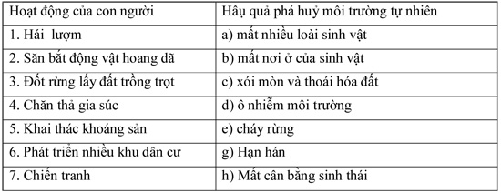 Câu 1: Chọn một hay nhiều nội dung thích hợp ở cột bên phải (kí hiệu bằng a, b, c....) ứng với mỗi hoạt động của con người ở bên trái (kí hiệu 1, 2, 3...) gây ra sự phá hủy môi trường. Ví dụ: 1.a (1,5đ)