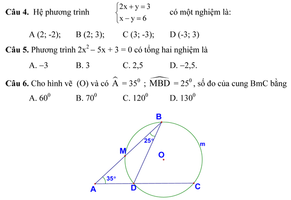 Trong mỗi câu từ câu 1 đến câu 6 đều có 4 phương án trả lời A, B, C, D; trong đó chỉ có một phương án đúng. Hãy khoanh tròn vào chữ cái đứng trước phương án đúng.