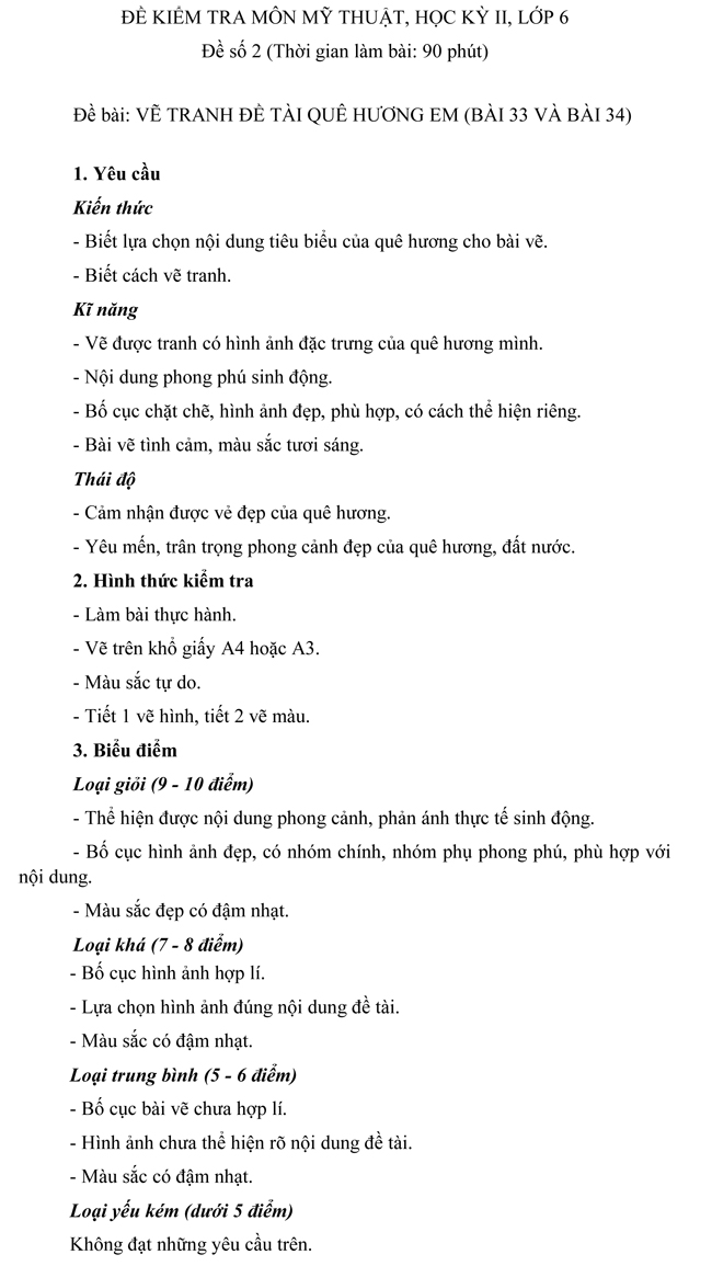 Tìm hiểu thêm »Đề kiểm tra học kì II môn Mỹ thuật dành cho học sinh THCS lớp 6 - Đề số 2