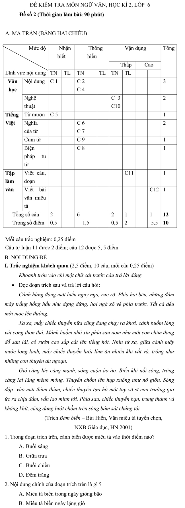 Đề kiểm tra học kì II môn Ngữ văn dành cho học sinh THCS lớp 6 - Đề số 2