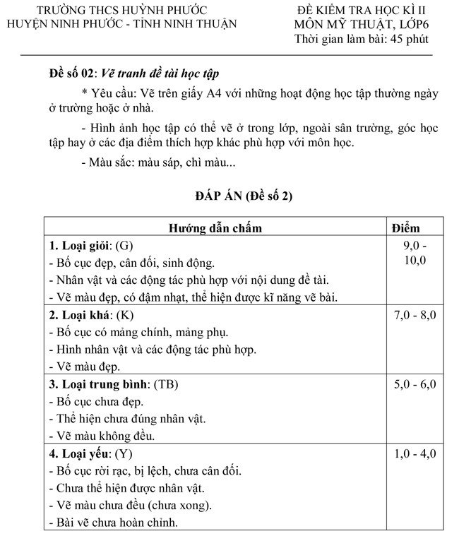 Tìm hiểu thêm »Đề kiểm tra học kì II môn Mỹ thuật lớp 6 trường THCS Huỳnh Phước, Tỉnh Ninh Thuận - Đề số 2