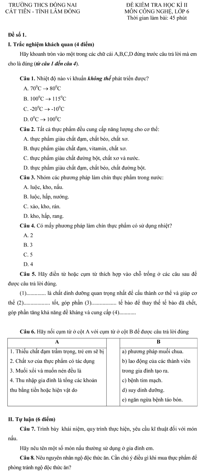 Đề kiểm tra học kỳ II môn công nghệ lớp 6 của trường THCS Đồng Nai Cát Tiên - Tỉnh Lâm Đồng - Đề số 1