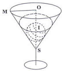 Cho cốc nước như hình vẽ, phần phía trên là hình nón đỉnh S, đáy có tâm O bán kính R = (dm), chiều cao SO = h = (dm). Trong cốc nước đã chứa một lượng nước có chiều cao a = 2(dm) so với đỉnh S. Người ta bỏ vào cốc nước một viên bi hình cầu thì nước dâng lên vừa phủ kín quả cầu. Hãy tính gần đúng bán kính của viên bi (làm tròn đến 4 chữ số thập phân)