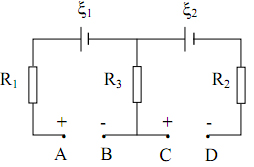 Cho mạch điện như hình vẽ, UAB = 10V, UCD = 7V; các nguồn có suất điện động ξ1 = 6V,ξ2 = 12V; các điện trở R1 = R2 = R3 = 50Ω; điện trở trong của các nguồn không đáng kể. Tìm cường độ dòng điện qua các điện trở R1, R2, R3.
