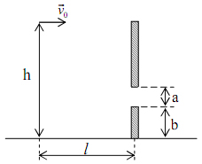 Từ một điểm ở độ cao h = 18m so với mặt đất và cách tường nhà một khoảng l = 3m, người ta ném một hòn sỏi theo phương ngang với vận tốc ban đầu v0. Trên tường có một cửa sổ chiều cao a = 1m, mép dưới của cửa sổ cách mặt đất mộtkhoảng b = 2m (hình vẽ). Hỏi giá trị của v0 phải nằm trong giới hạn nào để hòn sỏi lọt qua cửa sổ? Bỏ qua bề dày của bức tường.