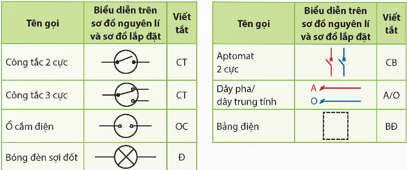 Trong các nhận định sau, nhận định nào đúng, nhận định nào sai về các kí hiệu điện trên sơ đồ nguyên lý và sơ đồ lắp đặt: