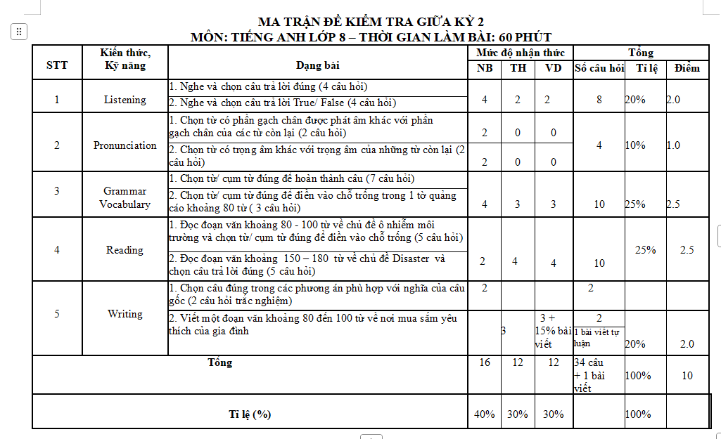 ĐỀ KIỂM TRA GIỮA KỲ 2 NĂM HỌC: 2024- 2025 MÔN: TIẾNG ANH - LỚP 8 Thời gian: 60 phút (Không kể thời gian giao đề) |