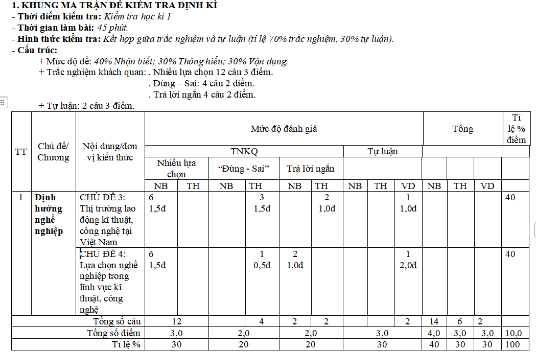 Lưu ý: Bộ đề thi cuối kì 1 Công nghệ 9 Định hướng nghề nghiệp được biên soạn với cấu trúc dưới đây. Tùy theo yêu cầu của từng Sở mà thầy cô ra đề cho các em nhé.
