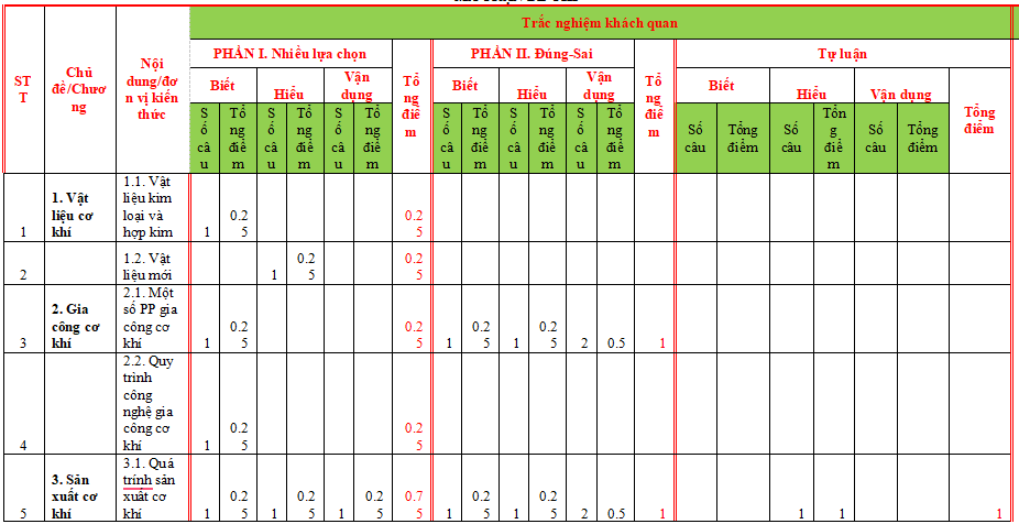 Ma trận đề thi học kì 1 Công nghệ 11 Cơ khí