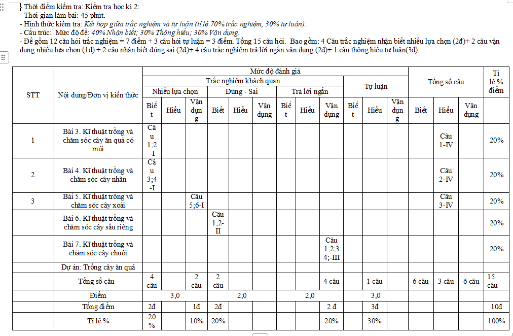 Lưu ý: Bộ đề thi cuối kì 2 Công nghệ 9 Trồng cây ăn quả được biên soạn với cấu trúc dưới đây. Tùy theo yêu cầu của từng Sở mà thầy cô ra đề cho các em nhé.