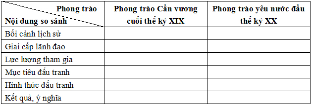 Hãy lập bảng so sánh phong trào Cần Vương cuối thế kỷ XIX với phong trào yêu nước đầu thế kỷ XX theo mẫu sau: