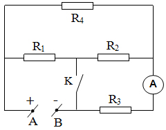 Biết: R1 = 8Ω; R2 = R3 = 4Ω; R4 = 12Ω; UAB = 8V. Điện trở của ampe kế, khóa K và các dây nối không đáng kể.