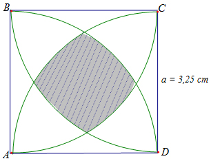 Cho hình vuông ABCD có cạnh a = 3,25. Tính gần đúng diện tích phần chung của 4 hình tròn có tâm lần lượt là các điểm A, B, C, D và có cùng bán kính là a (phần tô trên hình vẽ).