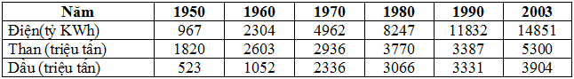 Sản lượng điện, than, dầu trên thế giới giai đoạn 1950 - 2003