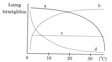 c. Lượng hêmôglôbin trong máu của động vật có xương sống ở nước phụ thuộc vào nhiệt độ của nước nơi chúng sống. Đường cong nào của đồ thị dưới đây mô tả đúng sự biến đổi này? Giải thích.