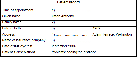 Part 1. Listen to a conversation between an optometrist and a patient and fill in the form. Write no more than 3 words or numbers for each blank