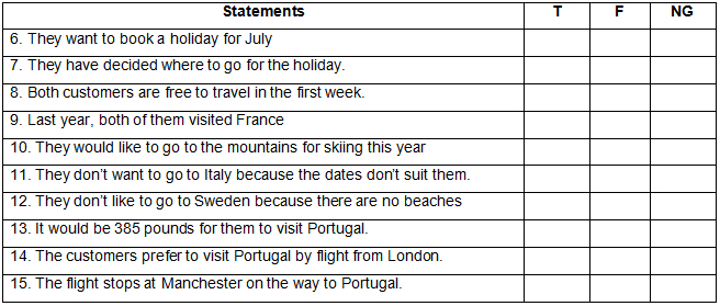 Part 2: You are going to hear a travel agent discussing the holiday booking with 2 customers. Listen to their conversation and decide whether the statements are True (T), False (F) or Not given (NG)
