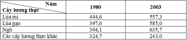 a. Vẽ biểu đồ thể hiện quy mô, cơ cấu sản lượng lương thực của thế giới năm 1980 và 2003.