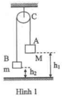 Cho hệ vật như hình 1. Hai vật A, B có khối lượng tương ứng là M và m. Biết M = 2m, ròng rọc là đĩa tròn đồng chất, khối lượng m, bán kính r, tiết diện đều. Dây nối dài, nhẹ, không dãn và không trượt so với ròng rọc. Lúc đầu hệ đứng yên, vật A ở cách mặt sàn một khoảng h1. Vật B cách mặt sàn một khoảng h2. Bỏ qua ma sat. Thả cho hệ chuyển động tự do.