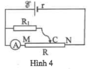 Cho mạch điện như hình 4. Biết nguồn có suất điện động 15V, điện trở trong r = 4Ω, điện trở R1 = 4Ω, biến trở MN có điện trở R = 20Ω. Ampe kế có điện trở không đáng kể.