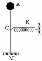 Cho hệ cơ như hình vẽ: Thanh MA có khối lượng không đáng kể, chiều dài l = 50cm, đầu tự do của thanh có gắn vật nhỏ khối lượng m = 100g, đầu M có thể quay dễ dàng. Lò xo nhẹ có độ cứng K = 100N/m, được gắn vào trung điểm C của thanh MA. Khi hệ cân bằng lò xo không bị biến dạng. Kéo quả cầu A ra khỏi vị trí cân bằng để thanh AM lệch khỏi phương thẳng đứng một góc nhỏ rồi thả nhẹ, lấy g=10m/s2.