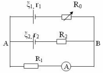 Cho mạch điện như hình vẽ. R1 = 10Ω; R2 = 5Ω; r1 = r2 = 1Ω; RA = 0; Khi thay đổi biến trở R0, số chỉ Ampe kế không thay đổi và luôn chỉ 1A. Tìm ζ1, ζ2.