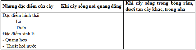 Trình bày ảnh hưởng của ánh sáng tới hình thái và sinh lí của cây theo bảng sau: