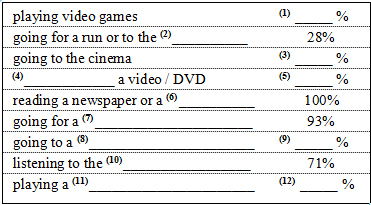Part 1: Listen to the results of a survey of leisure activities among people aged sixteen to thirty and fill in the missing information. You will listen to the tape three times.