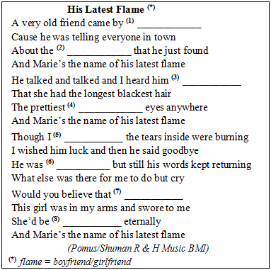 Part 2: You will listen to a song called His Latest Flame. Listen and fill in each numbered blank with ONE word. You will listen to the tape three times.