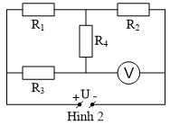 Có mạch điện như sơ đồ hình 2: R1= R2 = 20Ω, R3 = R4 = 10Ω, hiệu điện thế U không đổi. Vôn kế có điện trở vô cùng lớn chỉ 30V.