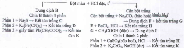 Cho biết thành phần của bột màu A và viết phương trình ion thu gọn của các phản ứng xảy ra.