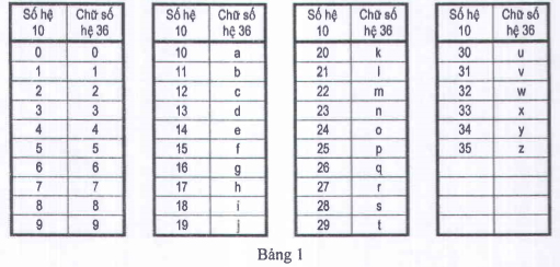 Để thực hiện luật Thuế thu nhập cá nhân, Tổng cục thuế phải cấp cho mỗi người có thu nhạp một mã số thuế sao cho không có hai người nào có mã số thuế trùng nhau. Tổng cục thuế quyết định chọn mã số thuế từ tập S bao gồm các biểu diễn trong hệ đếm cơ số 36 của tất cả các số nguyên dương trong phạm vi từ 1 đến n (36 ≤ n ≤1016). Để biểu diễn các chữ số trong hệ đếm cơ số 36, Tổng cục thuế sử dụng các ký tự từ 0 đến 9 và 26 chữ cái latinh từ a đến z theo quy tắc chỉ ra trong bảng 1. Một số trong hệ đếm cơ số 36 có thể hiểu là số biểu diễn trong hệ đếm cơ số q(2 ≤ 1 ≤ 36) nếu nó chỉ chứa các chữ số trong q chữ số đầu tiên trong hệ đếm cơ số 36.
