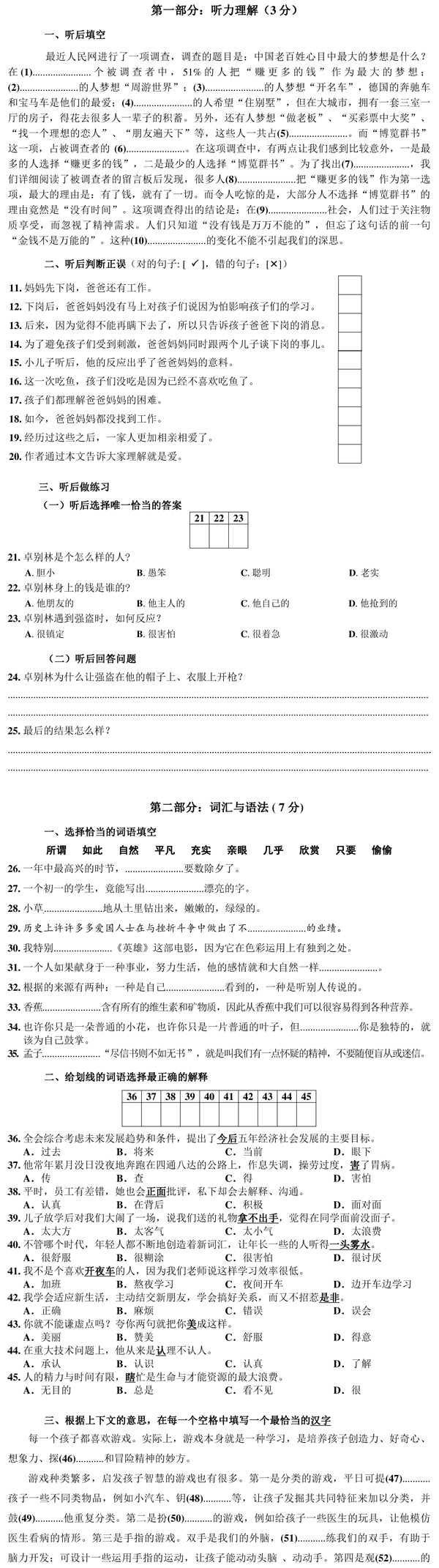 KỲ THI CHỌN HỌC SINH GIỎI QUỐC GIA LỚP 12 THPT NĂM 2011 Môn: TIẾNG TRUNG QUỐC Thời gian: 180 phút (không kể thời gian giao đề) Ngày thi: 11/01/2011 |