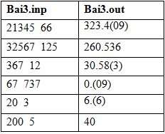 Kết quả ghi ra file văn bản Bai3.out: Là dạng thập phân của phân số P/Q theo quy cách như các ví dụ dưới đây: