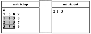 - Gồm một dòng chứa ba giá trị i, j, d cách nhau ít nhất một khoảng trắng, trong đó i, j cho biết vị trí (dòng i, cột j) đầu tiên của ma trận B cần tìm trong ma trận A, còn d cho biết số phần tử trên cùng một dòng của B. Chỉ số dòng và cột được tính từ 1 đến N. (nếu có nhiều ma trận vuông đối xứng cùng kích thước trong A thì chọn một trong số đó).