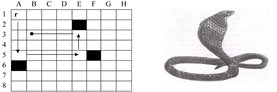 Một con rắn hổ mang sống trên một lưới vuông 8 x 8 có chứa vài vật cản (là các ô màu đen trong hình vẽ dưới đây). Con rắn di chuyển theo đường thẳng (khi còn có thể di chuyển được). Khi nó gặp vật cản hay gặp biên của lưới vuông, nó sẽ quay sang ô bên trái nó. Nếu nó